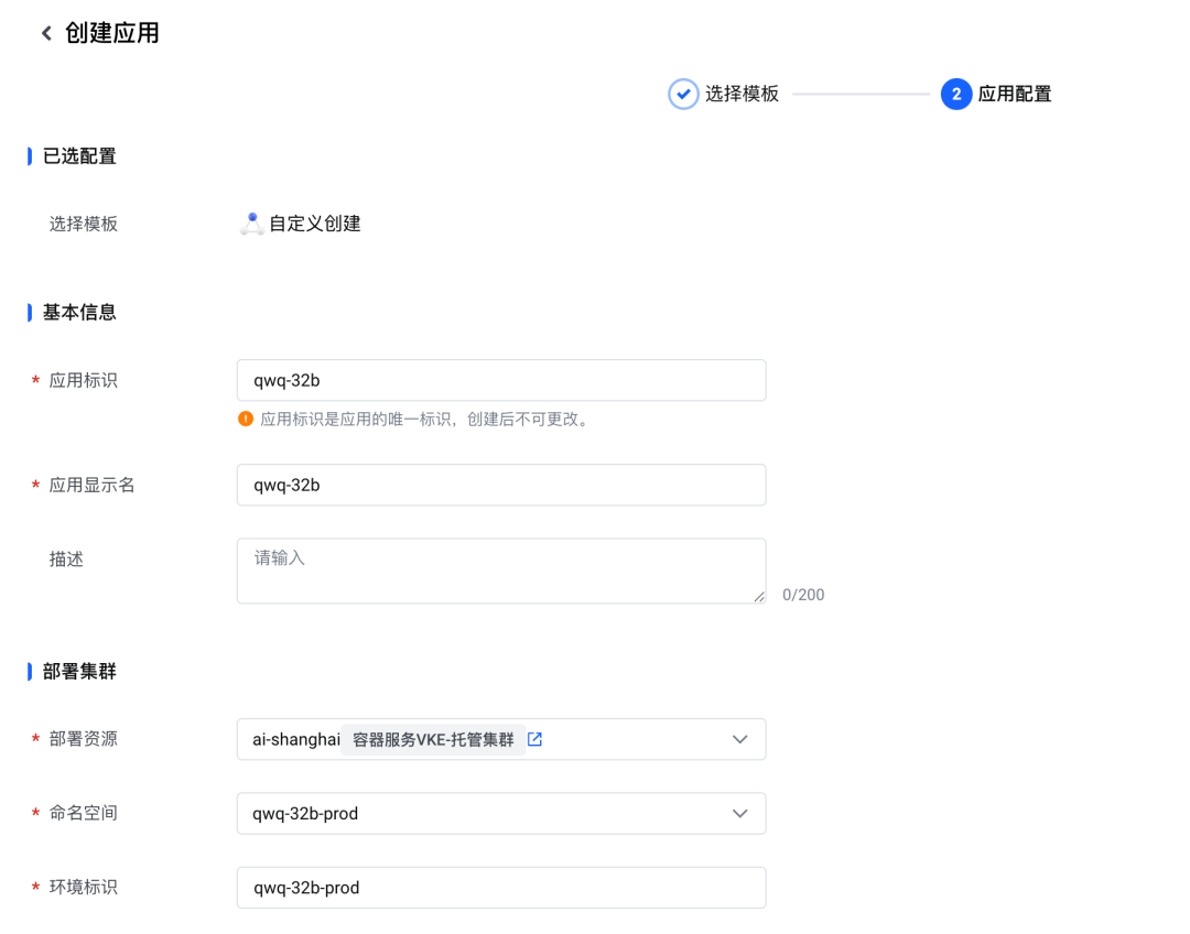 3.完成应用名、部署集群配置。需要注意的是,这里的部署集群需要选择上面创建的部署集群: