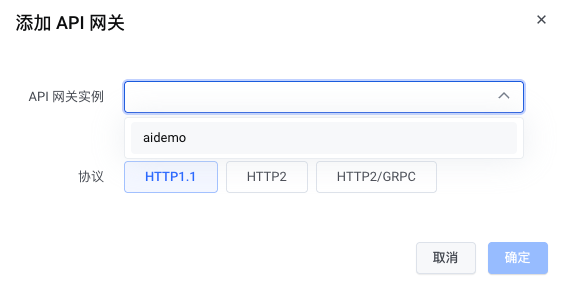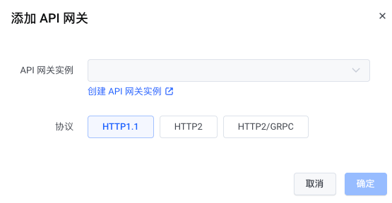 2.选择“添加 API 网关”,协议选择 HTTP1.1,如果还没有创建 API 网关,可以点击“创建 API 网关”: