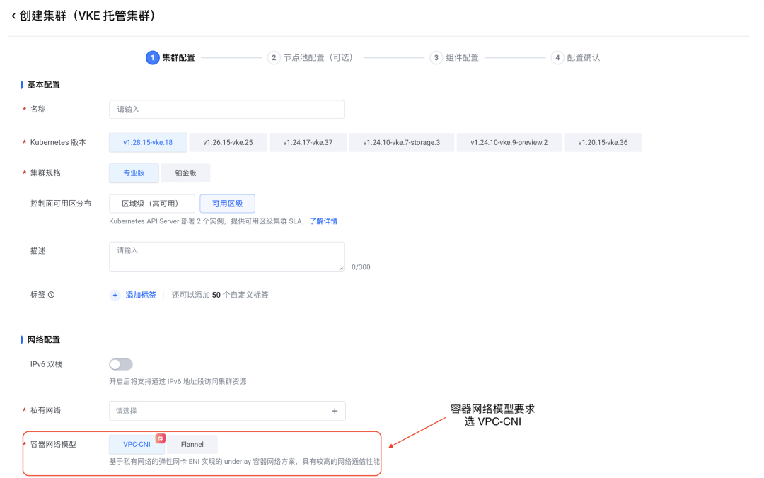 首先,进入火山引擎容器服务 VKE 工作台: https://console.volcengine.com/vke ,创建托管集群,网络模型建议选择 VPC-CNI: