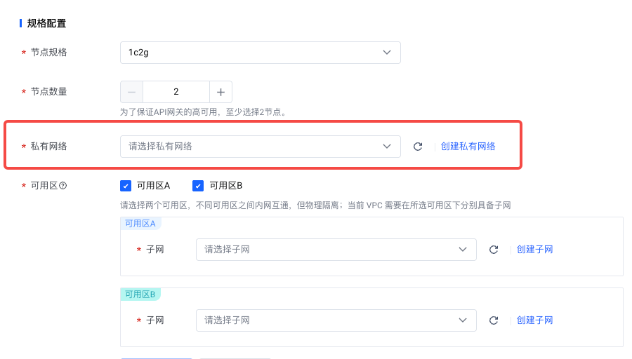 3.在创建API 网关时, 私有网络配置必须和之前创建 VKE 集群使用同一个私有网络, 网关的规格选择 1c2g,节点数量选择两个节点:
