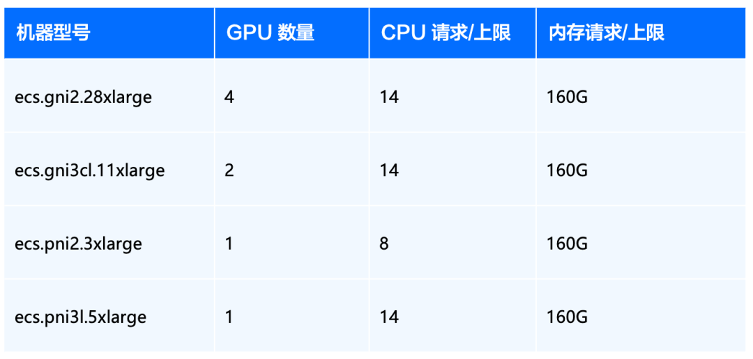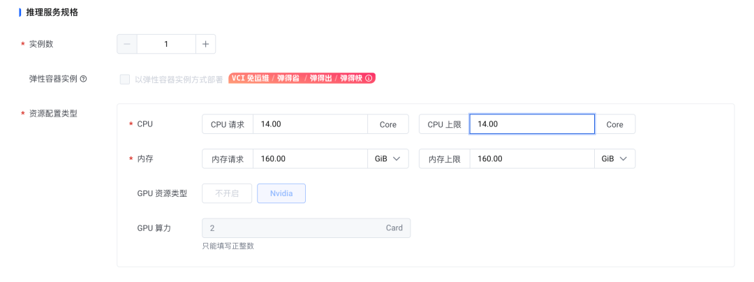 1.完成推理服务规格配置。实例数选择 1,根据不同机型,我们可以选择不同的配置,下表是一些推荐建议: