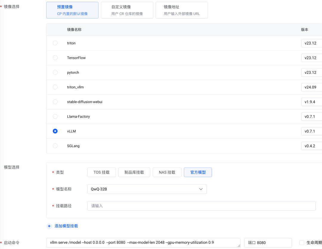 4.完成启动镜像和模型的配置。针对 QwQ-32B,这里我们可以选择 vLLM 镜像进行部署;模型可以直接选择 “官方模型”中的 QwQ-32B,挂载路径配置为 “/model”:
