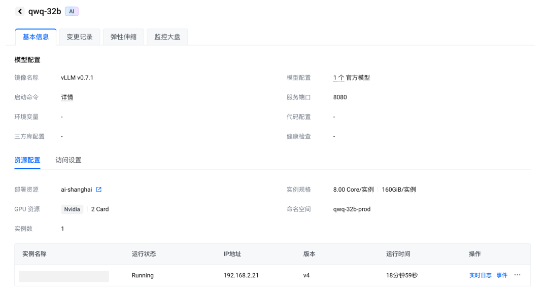 到这里,我们成功触发了 AI 应用部署,等待约 5 分钟左右,属于你的 QwQ-32B 服务就部署完成了。