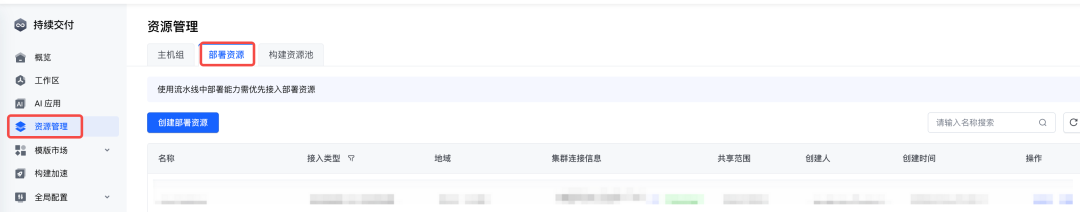 1. 打开火山引擎持续交付 CP 的产品工作台: https://console.volcengine.com/cp ,在左侧菜单栏选择 “资源管理-部署资源”,点击“创建部署资源”: