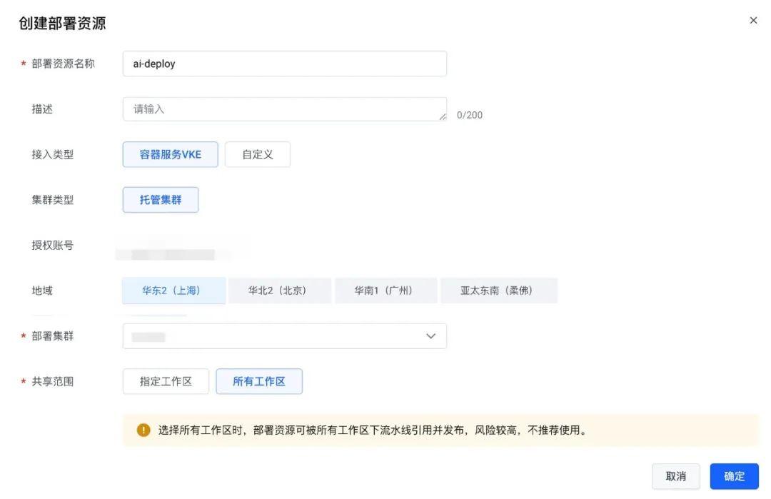 2.在创建部署资源表单中,“接入类型”选择“容器服务 VKE”,“地域”以及“部署集群”选中刚刚我们创建的部署 VKE 集群,“共享范围”选择“所有工作区”: