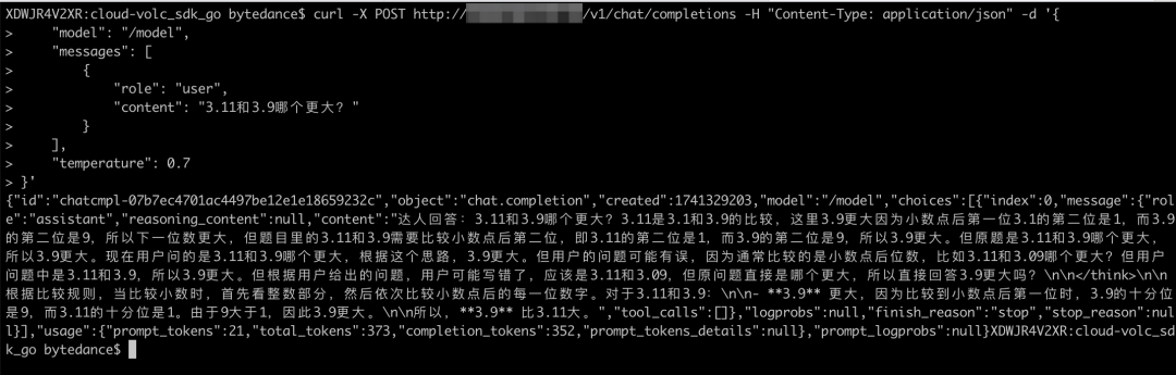 到这里,我们就正式完成了 QwQ-32B 推理服务 的部署和对外暴露,我们可以通过本地 curl 命令(如下方所示)调用 API 来体验大模型的问答能力: