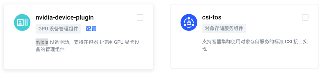 最后,在创建集群过程中,我们需要选择组件配置,这里要额外选择 csi-tos 和 nvidia-device-plugin 两个组件进行安装(相关文档:https://www.volcengine.com/docs/6460/101014 ):