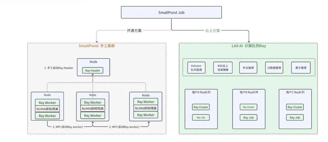 在该方案中,LAS 中的集群能够无缝的与 Smallpond 融合,只需要在云上开通资源 ,将 ray_address 设置成已开通的资源队里,其余逻辑无需改造,就可以完成数据预处理。