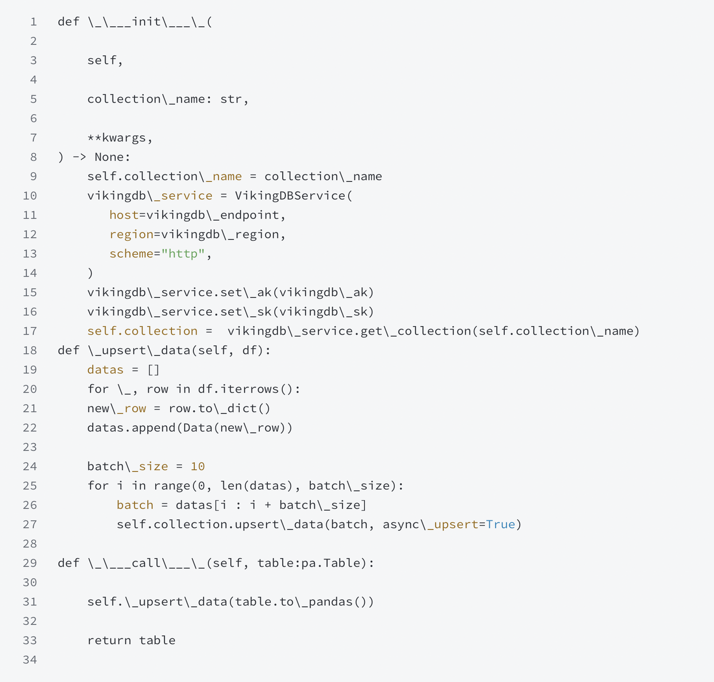 sp.read\_csv(paths, schema)\ .flat\_map(ChunkProcessor(input\_col\_name = "index"))\ .map\_batches(EmbeddingProcessor(input\_col\_name = "chunk"))\ .map\_batches(VikingdbSinkProcessor(collection\_name = vikingdb\_dataset))\ .take\_all()