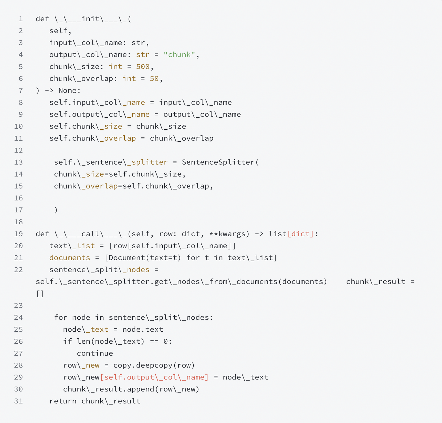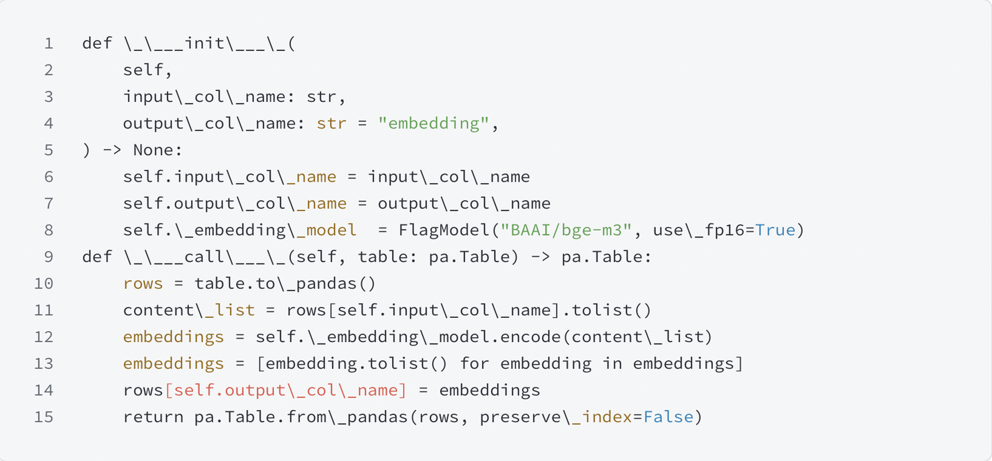 定义三种处理器:Chunk、Embedding、写向量数据库。由于SmallPond未提供写入向量数据库的接口,可以利用map_batches方法实现。