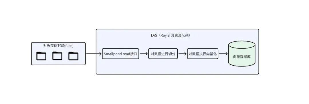 场景描述:在 RAG 架构的离线入库场景,通过 LAS 产品提供的 分布式计算能力 Smallpond,实现从对象存储到向量数据库的全流程优化。在该链路中,读取数据后,利用 Smallpond 高效完成数据的切分(chunk)和向量化处理,并最终将向量数据批量入库至向量数据库。