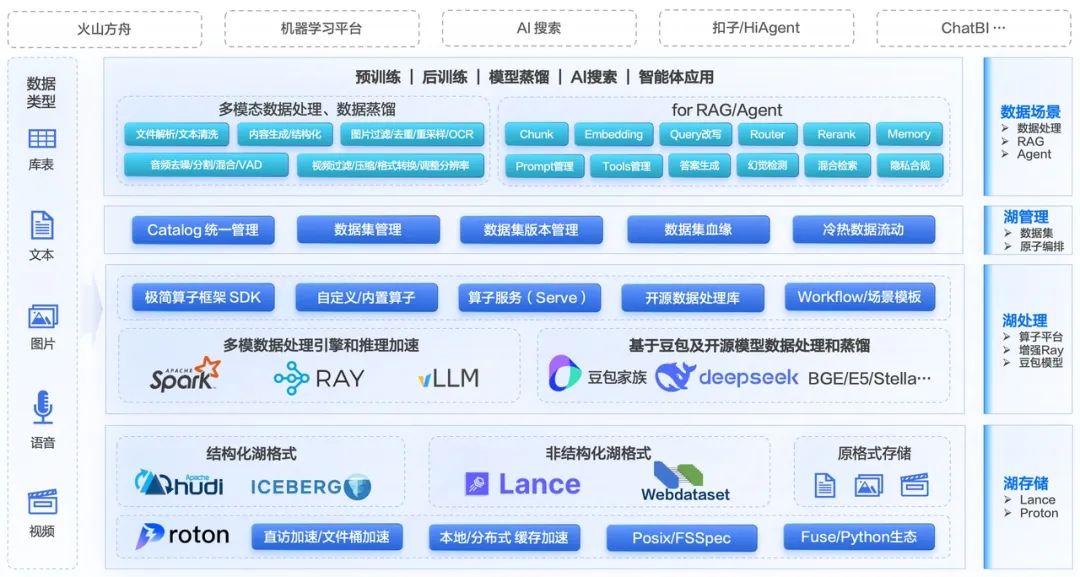 ·AI 场景支撑 :多模态数据湖如何支撑 预训练、后训练、知识库、AI 搜索、智能体、安全合规 等场景的智能化应用。