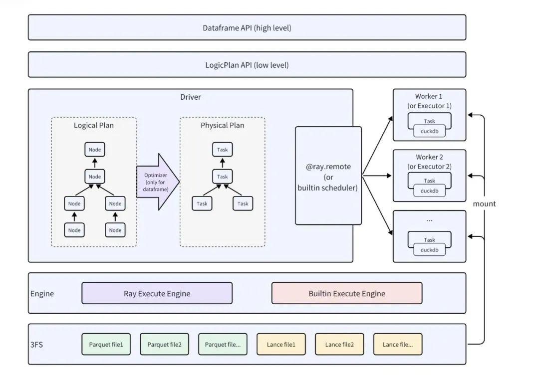 ·如果选用 Built-in 执行引擎,这个存储还是 task 的序列化存储用于从 driver 节点向 executor 节点派发任务。除了 3FS 存储,Smallpond 还支持 fsspec 接口 ,从而对接其他存储。