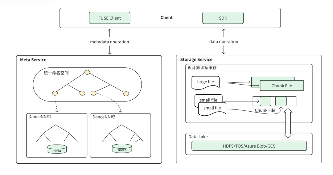 - 系统对外呈现统一的命名空间视图,内部由多组 DanceNN 组成。每组 DanceNN 负责管理目录树的一部分,通过主从架构实现高可用;