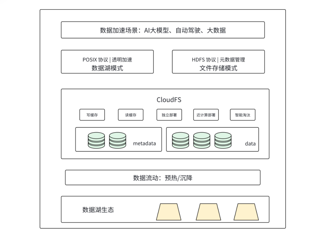 - CloudFS 采用数据湖 + 近计算缓存的存储模式,类似的方案被 JuiceFS、Alluxio 等系统广泛采用。在这种设计中,数据湖提供低成本存储空间存储全量数据,近计算缓存部分负责加速热点数据的读写性能;