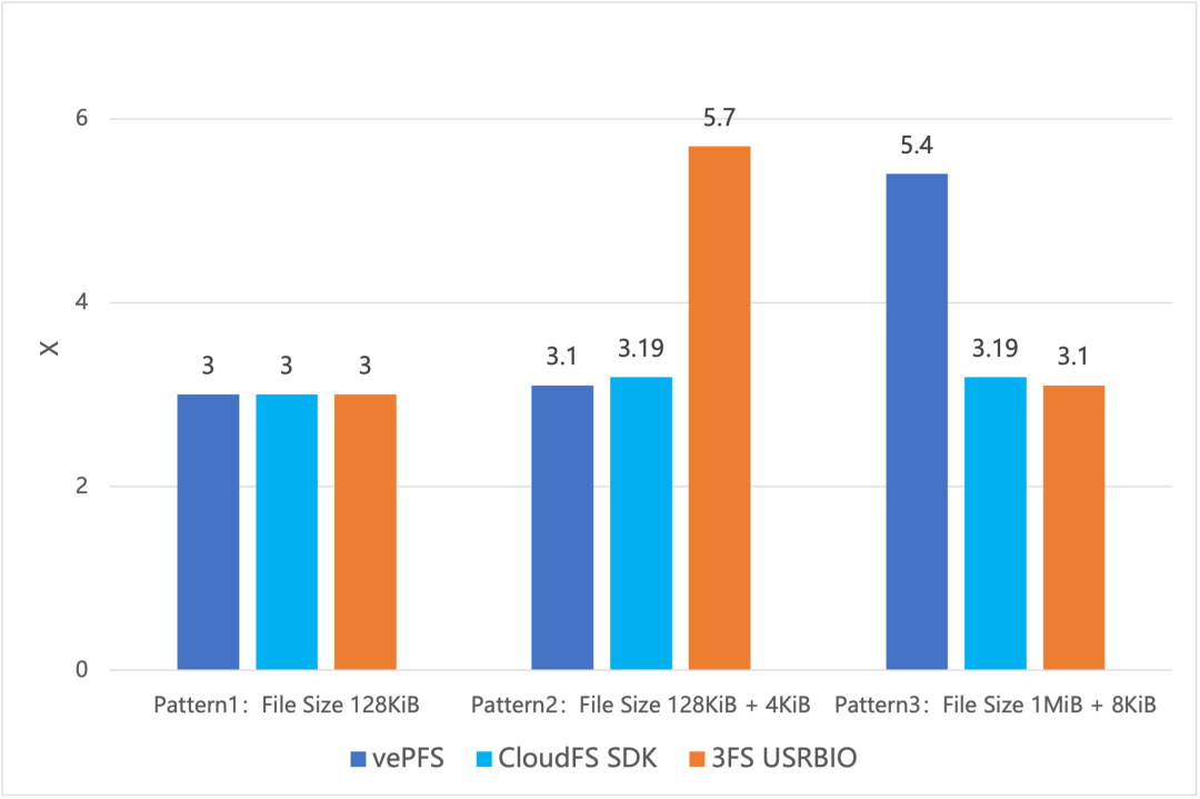 - 在 Pattern3 场景下,小文件 1MiB+8Kib,3FS 会占用 1MiB chunk 和 64KiB 的 chunk,空间放大到 3.1;vePFS 的 chunk 大小为 2MiB,此 Pattern 下文件占用 chunk 空间超 1/2,剩余 chunk 空间会作为碎片损耗造成放大,如果后续遇到比剩余 chunk 空间小的文件写入,碎片空间依旧可以复用。