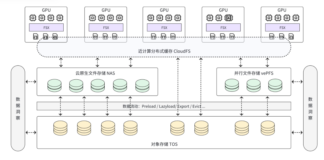 - 并行文件存储 :厂商直接使用公有云中成熟的并行文件存储产品进行训练和推理工作,比如火山引擎 vePFS、阿里 CPFS、AWS FSx for Lustre、腾讯 CFS Turbo 等,借助数据流动模块打通并行文件存储到对象存储之间的数据流动工作;