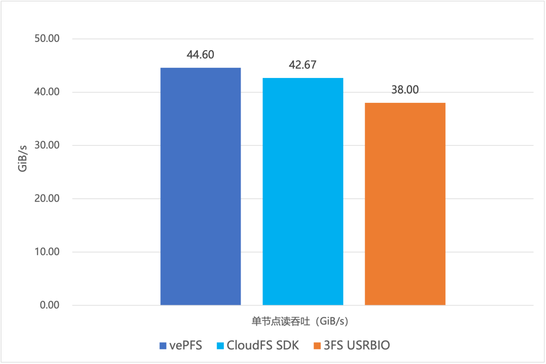 结果分析 :vePFS、CloudFS 都是采用星型模式写入,性能更极致,单节点的性能较高。3FS 采用主路由模式各个副本间链式串行写入,存储侧多出 2 倍的串行写入时延,在同等并发情况下,实测过程中存储节点收到的压力较低,且 CPU 很闲,系统写吞吐无法压上去,没有充分发挥后端存储性能,该数值并不代表 3FS 存储节点写吞吐上限低。
