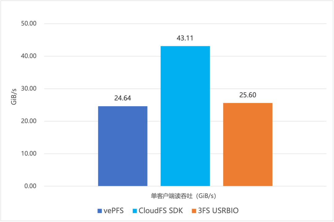 结果分析 :从数据结果上看 vePFS 和 CloudFS 单客户端写能力能够达到较高水平。实测 3FS 单客户端写吞吐较低,即使加大并发和调参,也无法提升单客户端写吞吐能力,此数据理论上仍有调优空间,欢迎大家交流和指正。