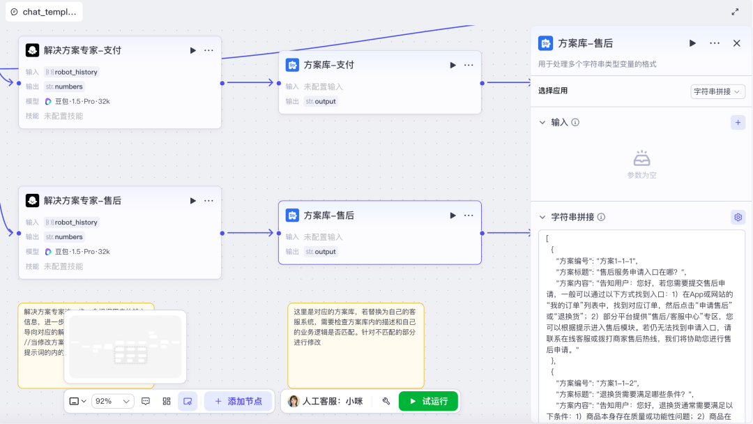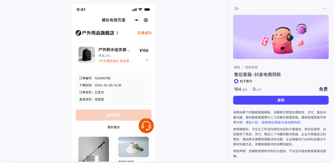 在电商客服场景,抖音电商团队基于扣子做了许多有益实践,其中,售后客服这一场景的 Agent 实现了开源,在扣子平台的模板商店即可免费使用。 该模板可帮助处理物流、支付、售后问题问题,提供智能客服替代人工回复的搭建思路。企业或个人可以基于自身定制化需求,修改该 Agent 和工作流的各种设定。