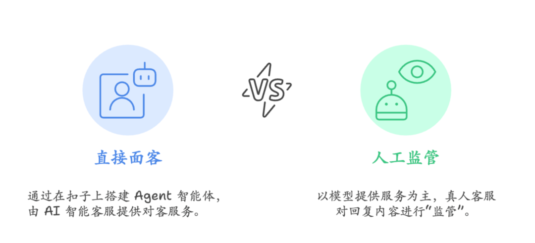 1.Agent 直接面客 :由 Agent 智能客服提供对客服务。通过在扣子上搭建 Agent 智能体,结合过往对话过程中积累的各种常见问题和解决方案。