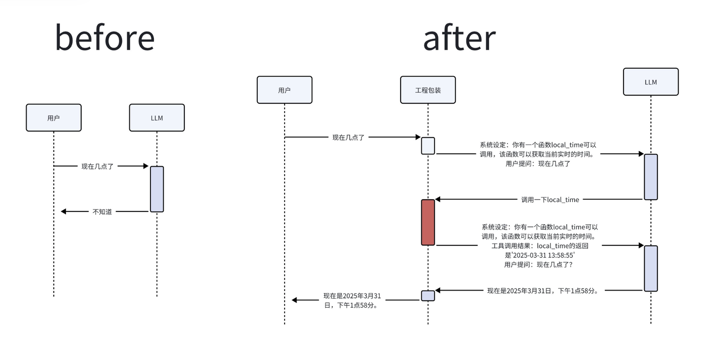 在改进后的工作流中,工程包装帮用户完善了环境信息,甚至在用户不知情的情况下,与大模型多进行了一次调用。其中红色块,是工程包装层调用了 local_time