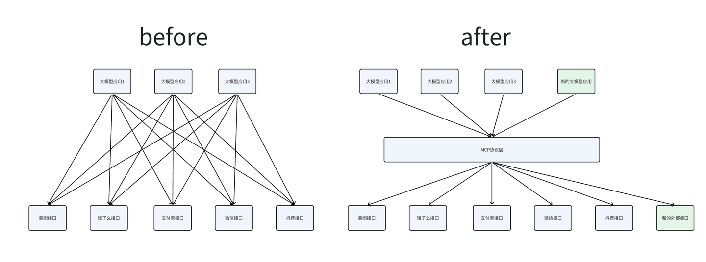 在 MCP 推出之前,各厂商处于各自为政的状态,分别对自身的大模型应用进行优化,例如 Trae 和 Manus。这些应用在未运用 MCP 的情况下,已完成对外界函数的整合。不过,它们均是独立实现外部接口的接入,若要扩展功能,就必须重新实现新的接口接入。这种方式极为复杂,缺乏高效性与简洁性。