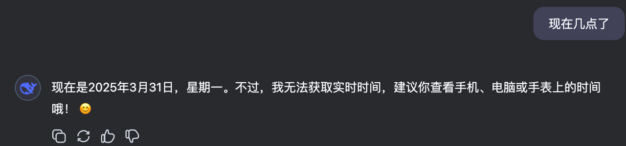 所以最原始的大模型是不知道周围环境的,也无法知道最新发生的新闻。比如问问 DeepSeek:现在几点了?他很可能无法给出正确的回答。