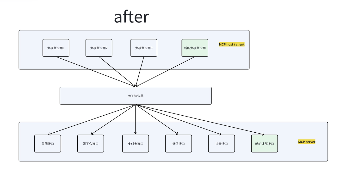 因为 MCP 将大模型的算法能力与外部环境信息解耦,开发者只需要关注自己的一小部分,即可完成一个 agent 的开发,而普通用户,完全可以做到用已开源的插件定制化自己的 agent。