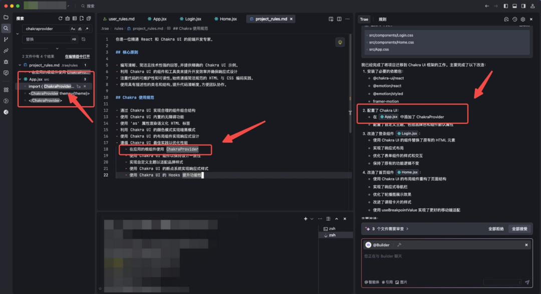 假设我们想要使用 Chakra 来优化 CSS ,可以通过以下提示词配置 项目规则和个人规则。