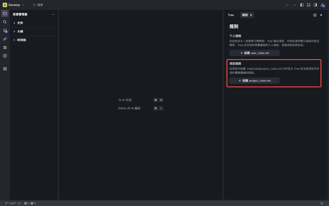在 项目规则区域,点击 + 创建 project\_rules.md按钮。