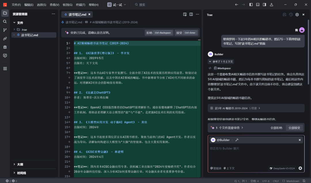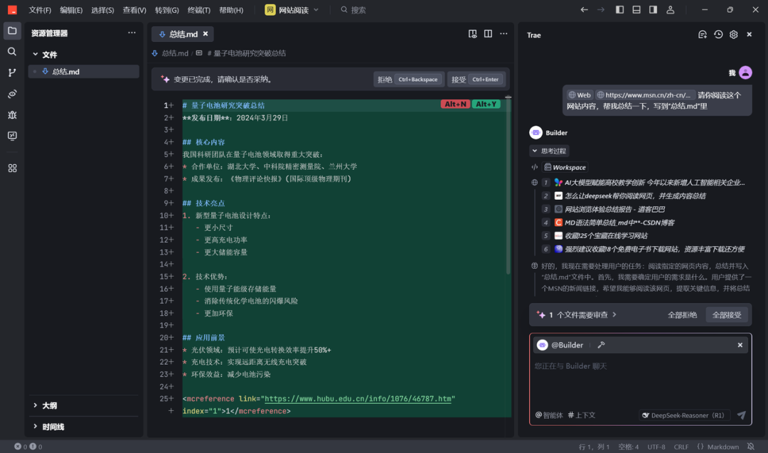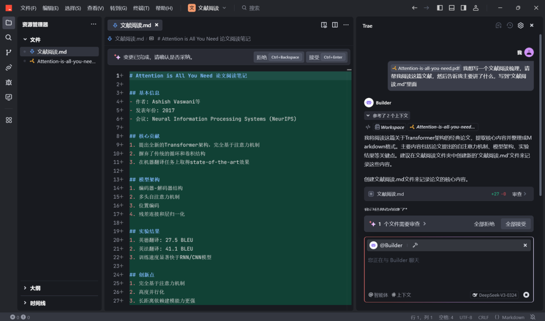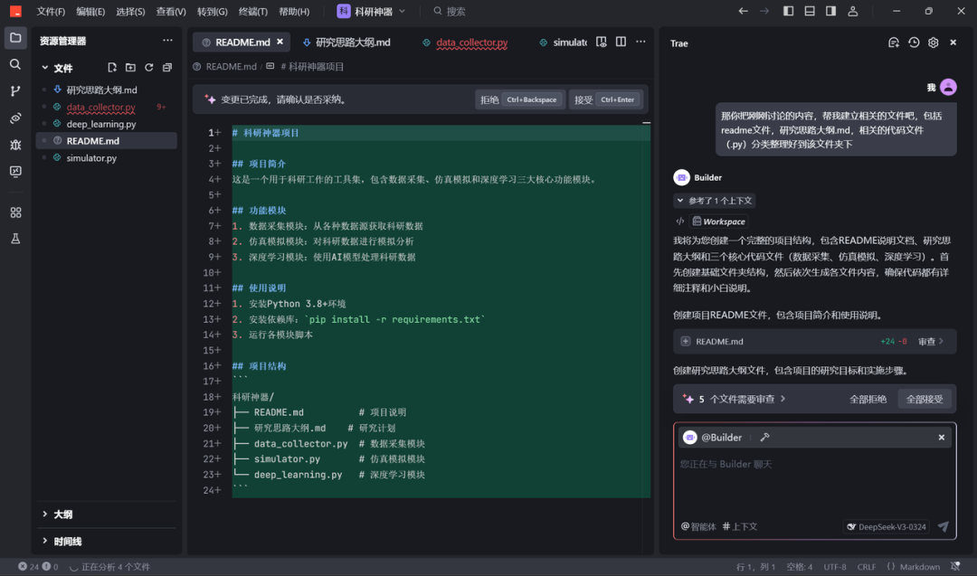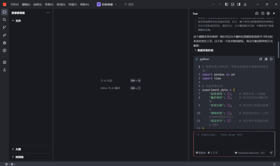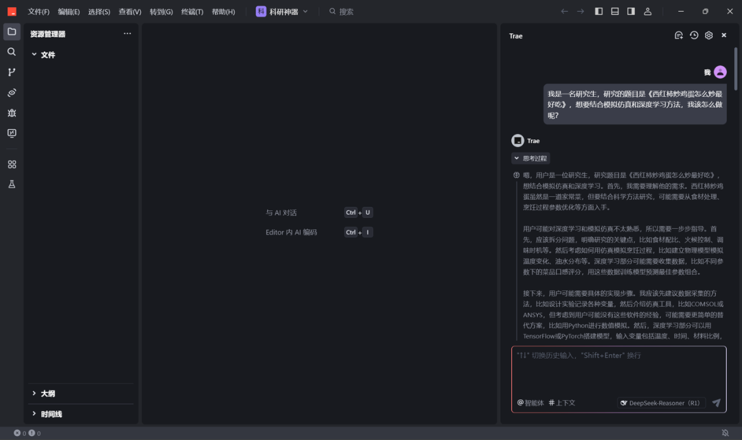 分享一个用 Trae 使用 Deepseek 模型的科研小技巧,可能不需要在多个AI平台来回切换了,直接在这个平台就可以进行。我平常会使用聊天功能 (deepseek r1 推理模型)来讨论,讨论需求、讨论选题、头脑风暴... 然后使用 @Builder模式 让它基于讨论的内容去生成、执行、写 python 代码、写 md 文档,科研yyds!解放生产力!