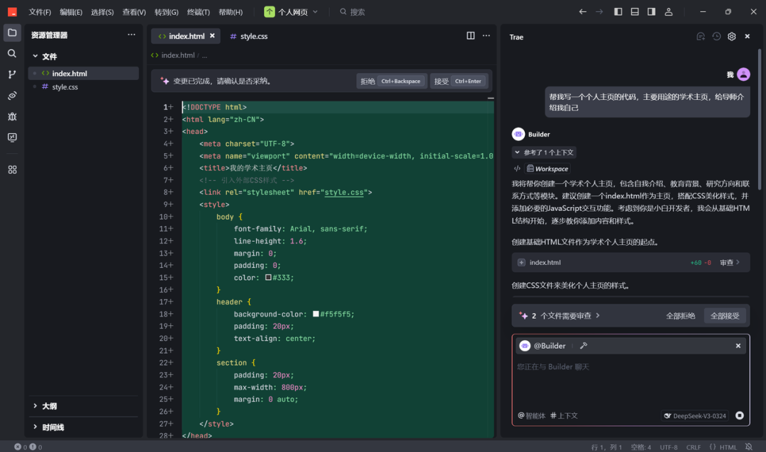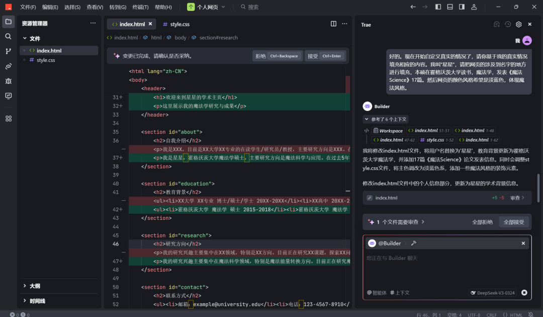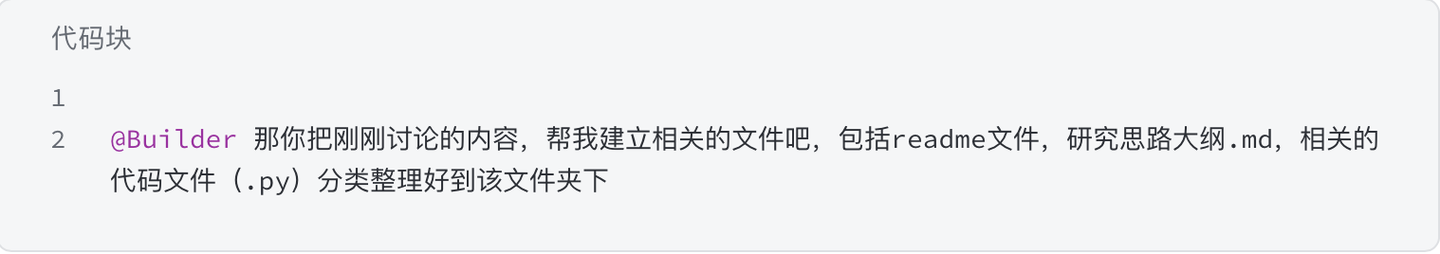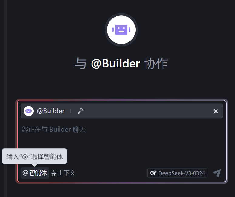 - 当我们需要建立项目,让 AI 对项目、代码直接进行编辑、修改、建立,我们 @Builder调用智能体,然后再进行给出需求(相当于原 Builder 模式):