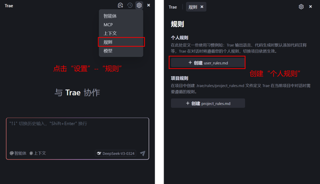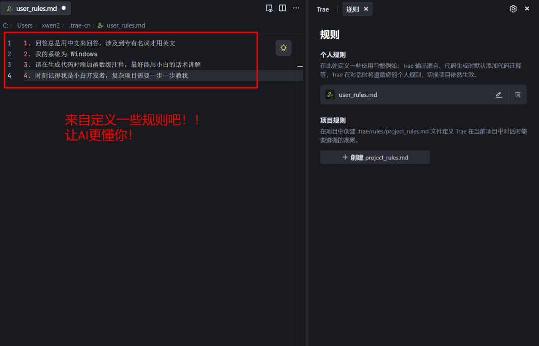 如何和 Trae 协作? 那么我们可以个性化一些规则,比如说清楚我们是小白/专业级的开发者,它会根据不同的个性化来进行输出。如果你是小白,它会始终保持通俗易懂的语言进行输出;如果你是专业的开发者,那么它也会保持严谨精确的语言进行输出,总之,来自定义个人的规则吧!