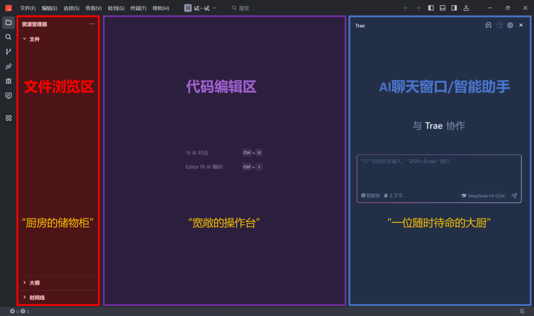 但如果你是小白,只为提高工作效率,那么接下来的比喻可能有助于你理解:想象一下你正在一个设备齐全的厨房做菜,Trae 的界面布局就像厨房一样科学合理,各种工具和功能都有序排列,让你可以轻松找到并使用。