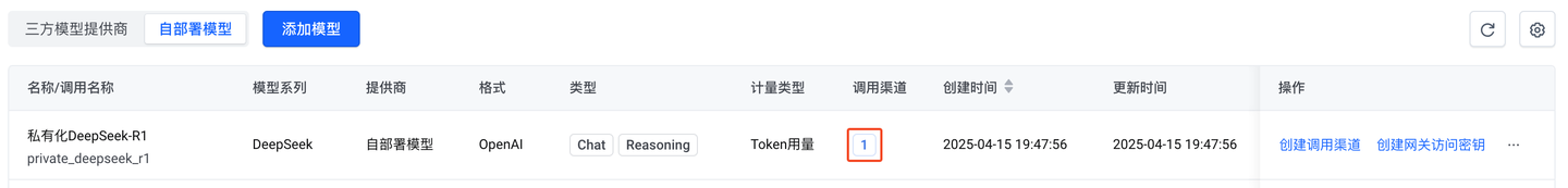 在自部署模型列表,调用渠道数字表示一个自部署模型下已创建的调用渠道的数量。以上操作完成后,相应自部署模型的调用渠道数量会增加。您可以单击调用渠道数字,查看和管理(如编辑、删除)自部署模型下已添加的调用渠道。