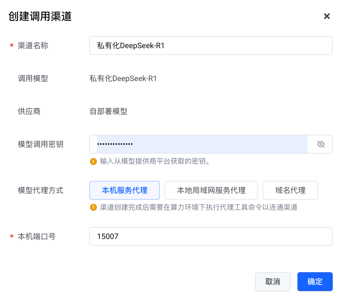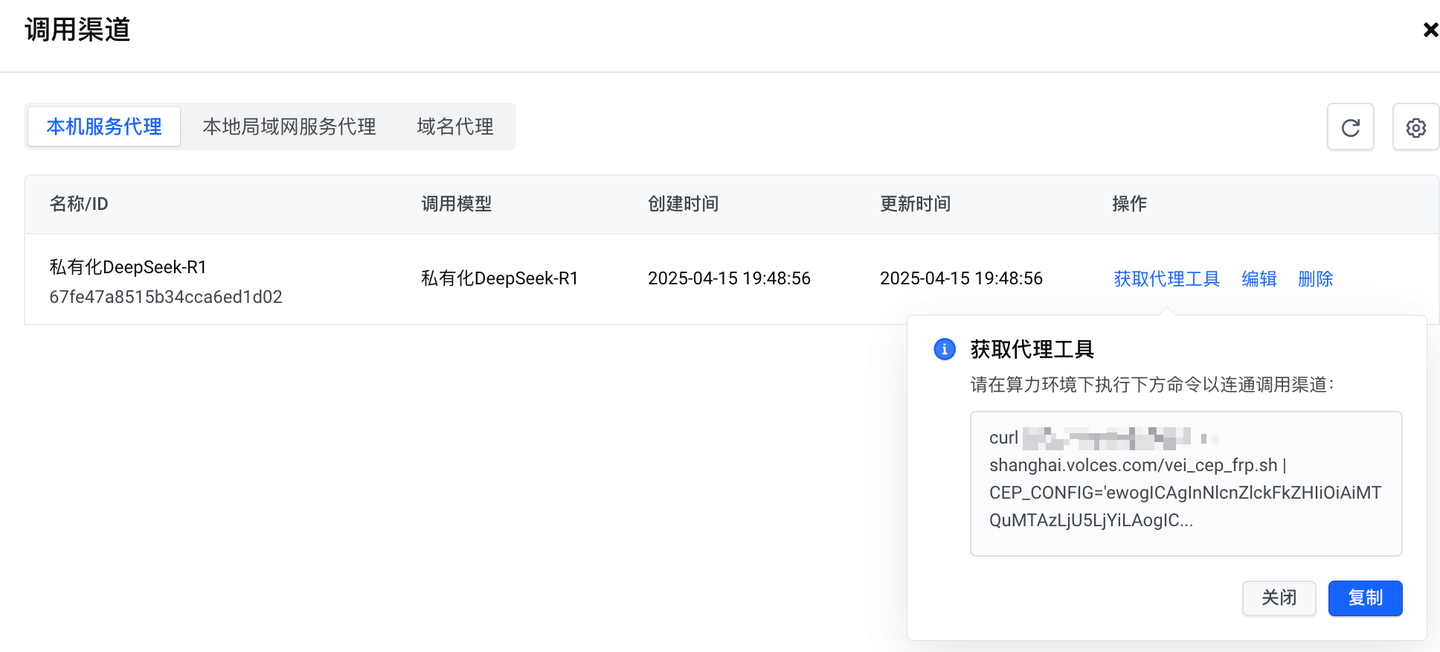 - 在调用渠道创建成功后,您还必须在模型服务所在局域网内的任意一台服务器上运行指定的代理工具。