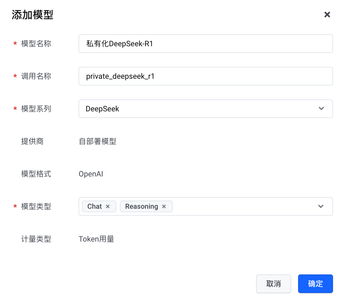 - 模型类型:选择模型的类型。模型类型决定了模型的用量计量方式。您可以在类型选项上查看对应的计量方式(如 Chat 类型对应于 Token用量)。支持多选,但只允许选择用量计量方式相同的多个类型。