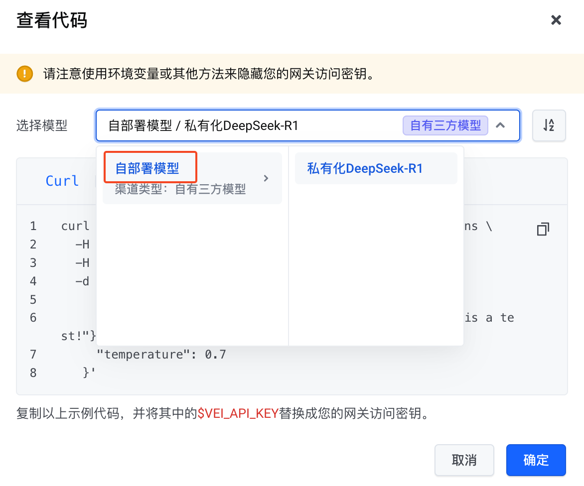具体操作,请参见使用网关访问密钥(https://www.volcengine.com/docs/6893/1362929)。需要注意的是,当您查看示例代码时,在选择模型中选择您的自部署模型。