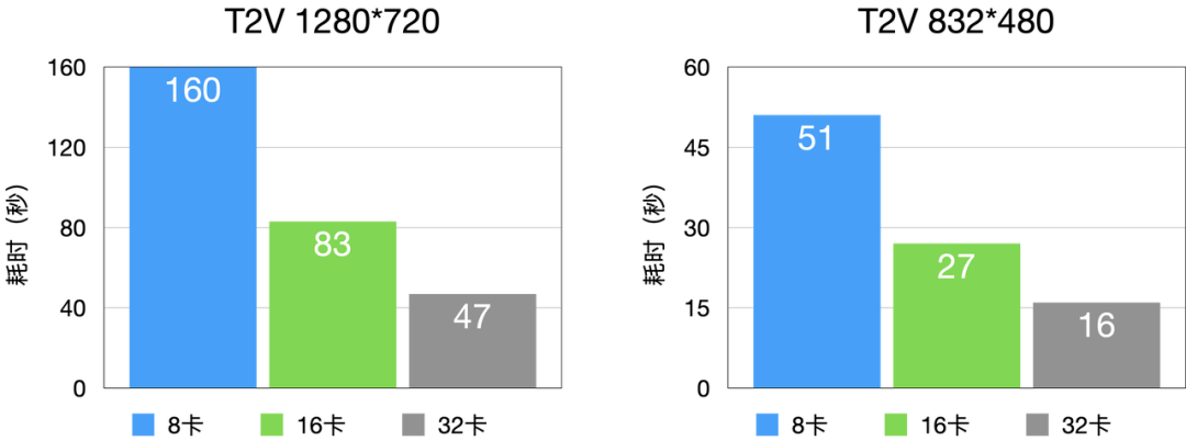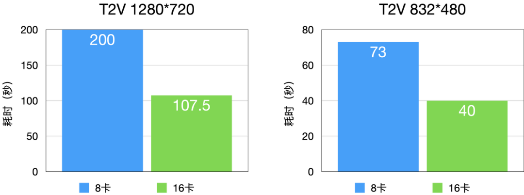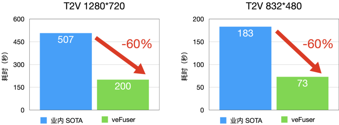 T2V (Text to Video,文生视频)性能相较于业内 SOTA 水平延时降低 60% 左右,480P 每 infer-steps 平均 1.5 秒,720P 每 infer-steps 平均 4 秒。