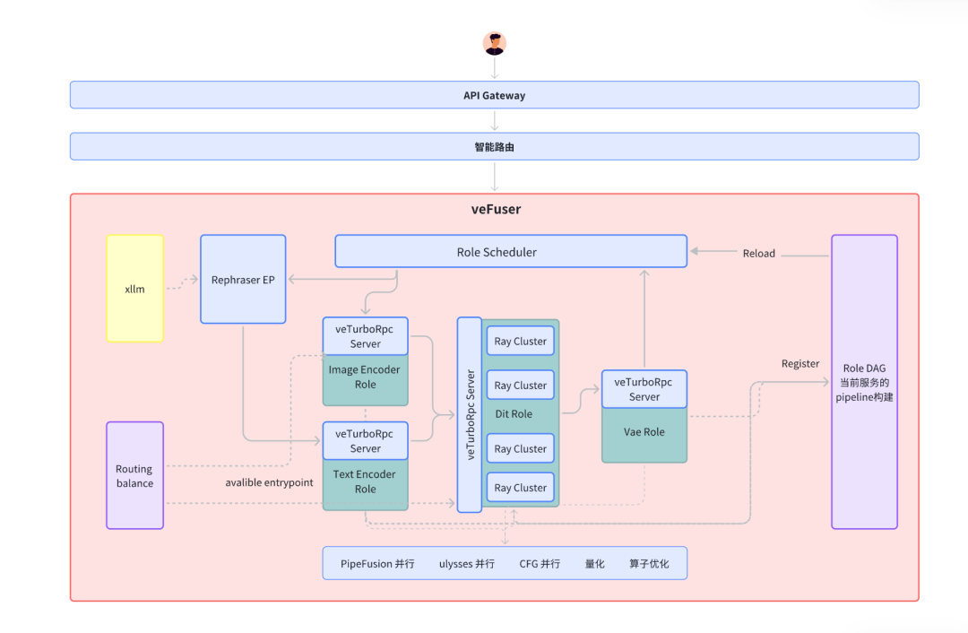 - 分布式架构:扩散模型的工作流往往包含多个独立的角色(如 Text Encoder、VAE 、LLM 等),各个阶段对显存、计算、带宽等不同资源的瓶颈不同。针对这一特点,我们为不同角色选择最适合的并行方法和资源配置,并将工作流看成一张 DAG。将耦合的一个工作流中的不同角色(如Encoder、VAE、DiT等),拆分为独立的微服务,并通过统一调度异步执行没有依赖的角色,比如 image encoder 和 text encoder。