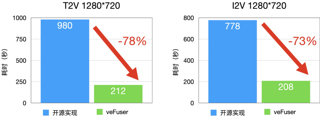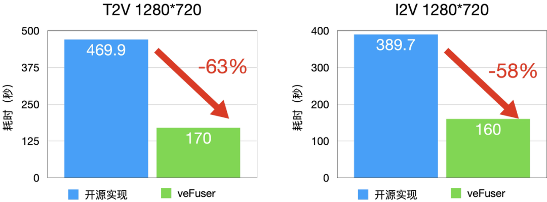 - 内存优化:veFuser 根据模型结构优化中间结果内存排布,消除算子激增导致的临时内存开销。在仅 24GB 显存的 GPU 上,veFuser 可流畅运行 720p 视频生成任务。