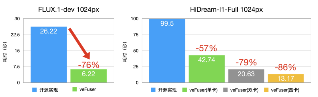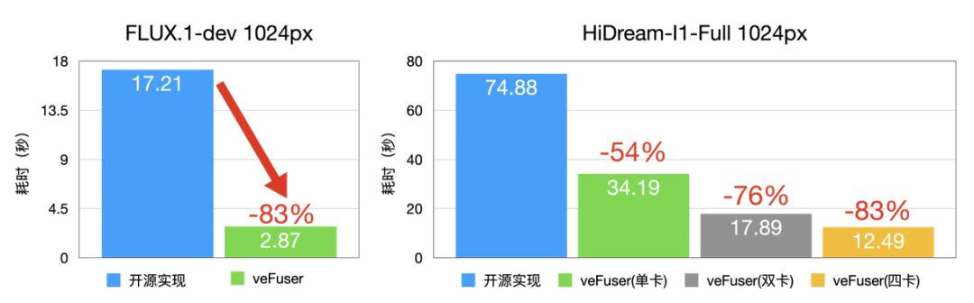 veFuser 针对硬件资源的优化极为出色,即使在配备 24GB 显存的低端 GPU 上,也能高效运行当前主流的图像生成模型,如 FLUX.1-dev(12B) 和 HiDream-I1-Full(17B)。与开源实现相比,veFuser 将推理时间缩减了 83%,极大提升了生成效率。在 FLUX.1-dev 模型上,出图时间只需 3 秒;在 HiDream-I1-Full 模型上,出图时间只需 13 秒。这一性能突破不仅显著提升了用户体验,还通过降低对高端硬件的依赖,减少了部署和运营成本,提供了更具性价比的生成式 AI 解决方案。