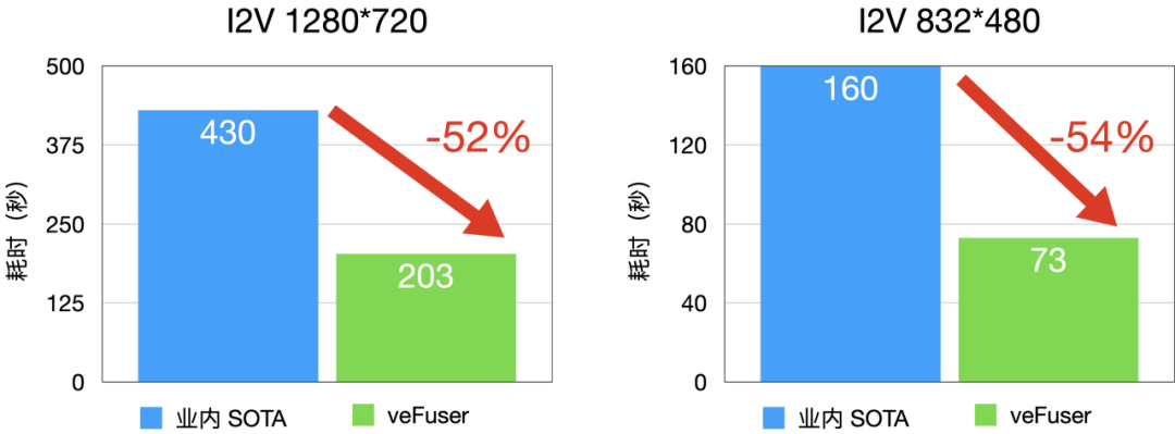 I2V (Image to Video,图生视频)性能相较于业内 SOTA 水平延时降低 50% 左右,480P 每 infer-steps 平均 1.8 秒,720P 每infer-steps 平均 5 秒。