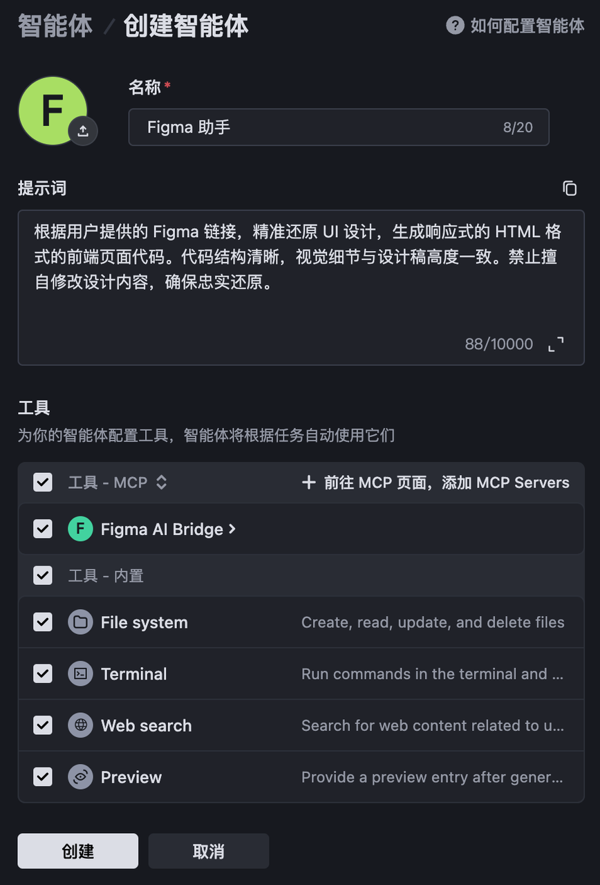 第五步:创建自定义智能体并为其配置 Figma AI Bridge