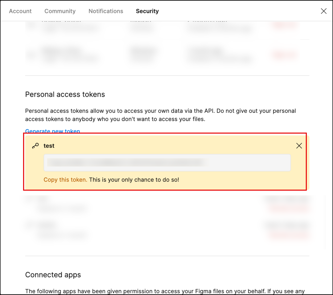 5.在 Figma 页面上复制先前创建的 Figma Personal Access Token,然后粘贴至输入框中。