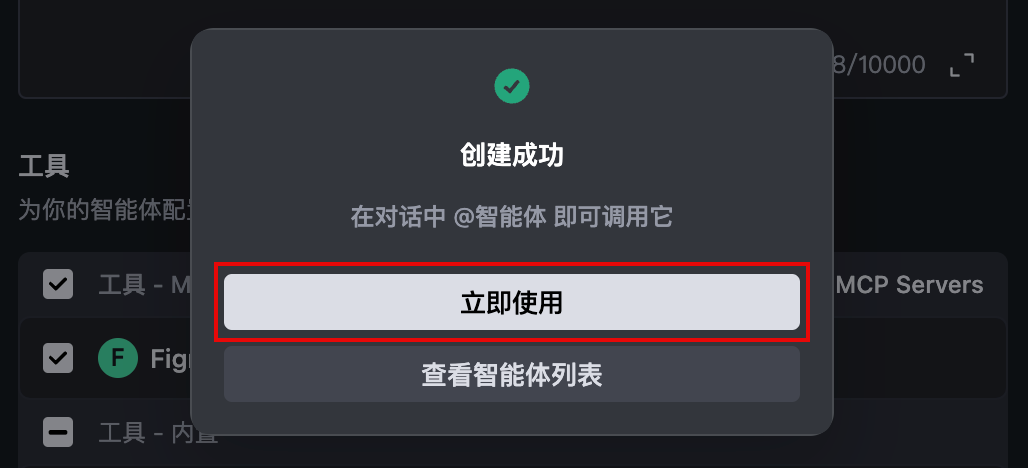 配置了 Figma AI Bridge 的智能体创建成功。你可以点击 立即使用 按钮,开启与智能体的对话。