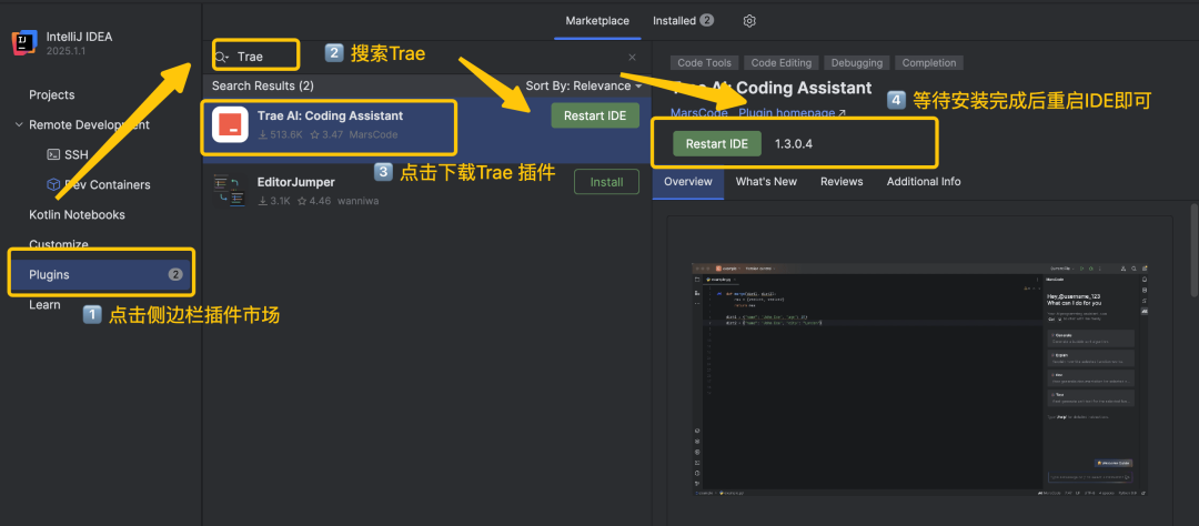 ● 新用户: 在中IntelliJ IDEA 左侧插件市场 搜索「Trae」并安装,安装成功后重启IDE,点击侧边插件图标跳转登录即可;
