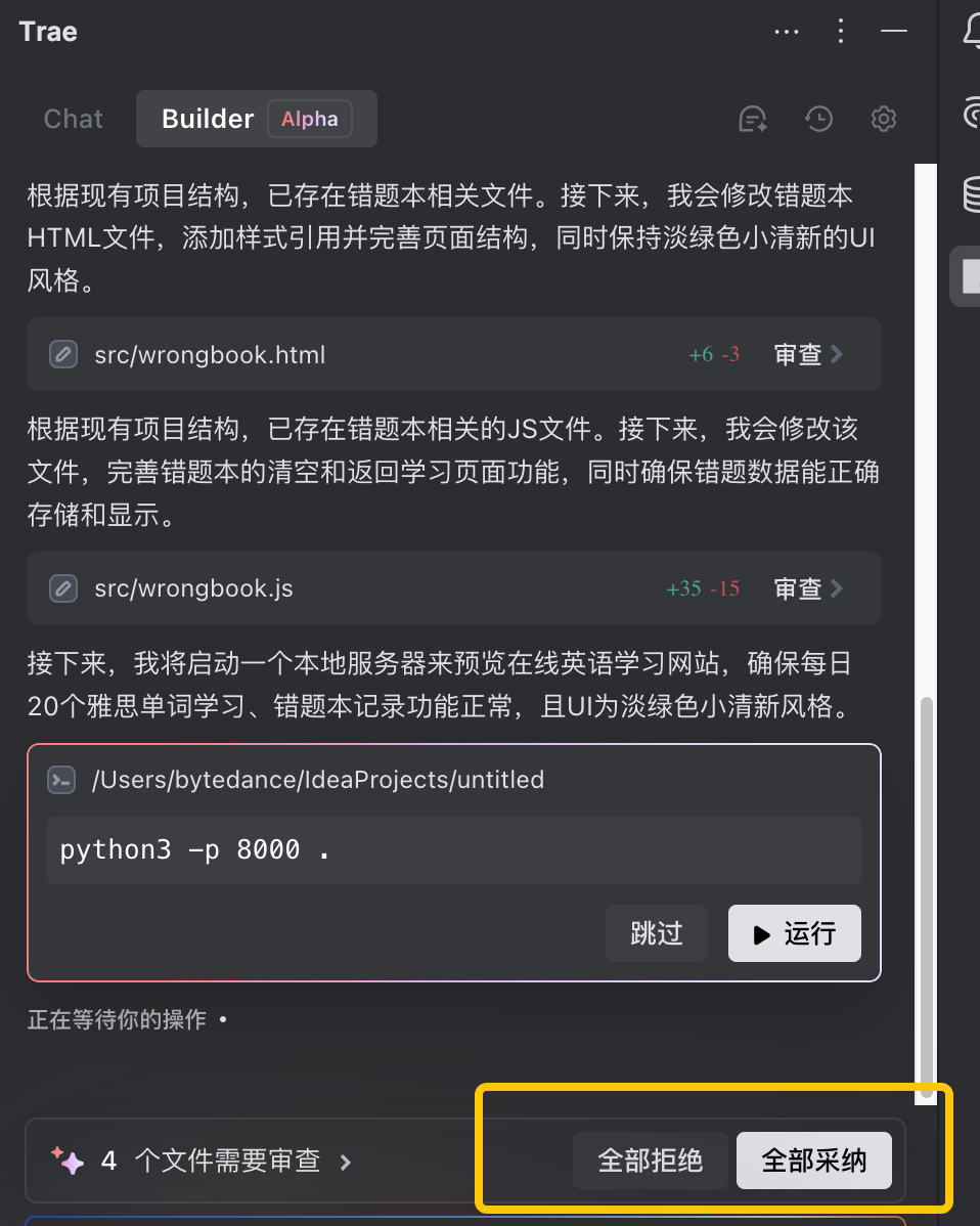 Builder会根据你的开发需求,适时推荐必要的 Shell 命令供你运行。你可以选择“运行”或“跳过”,Builder会根据你的操作完成后续的工作。