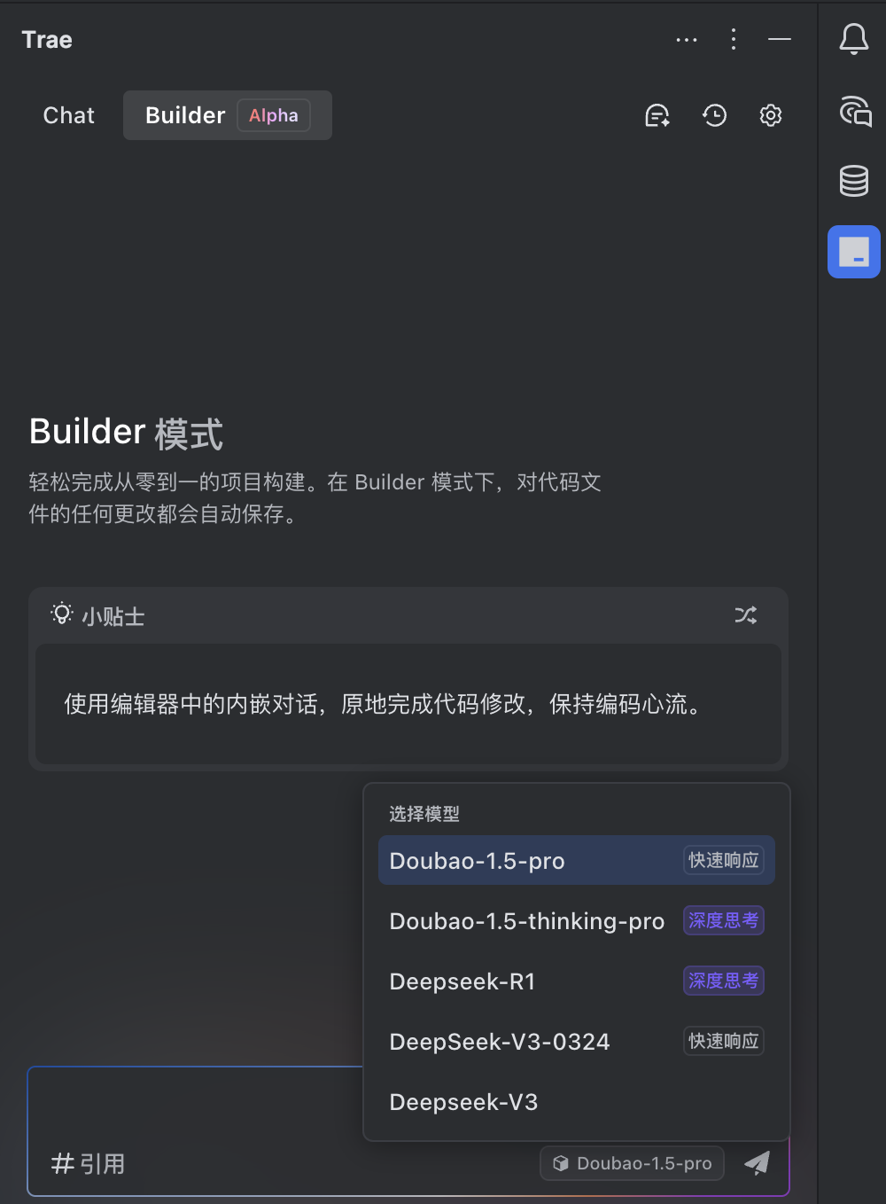 Trae 插件内置了豆包大模型1.5 、Deepseek-R1、DeepSeek-V3和DeepSeek-V3-0324等主流 AI 模型,并可随意切换,这些模型在代码生成和问题解答方面具有出色的性能,可高效赋能开发者。